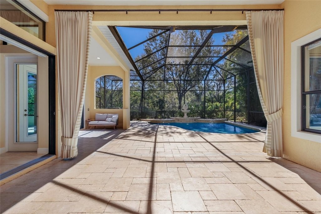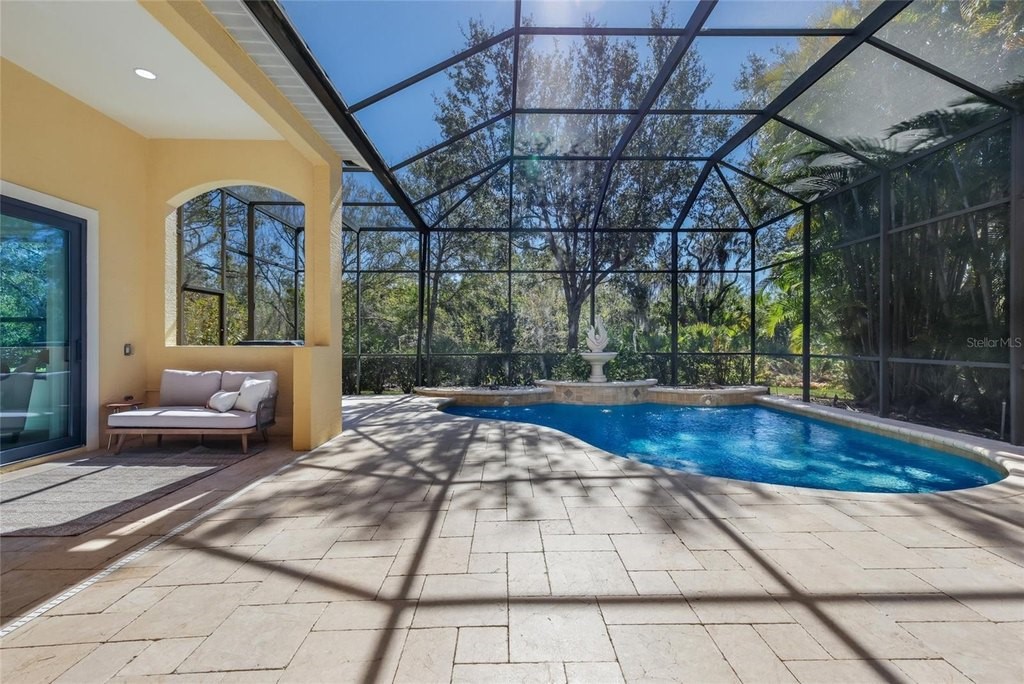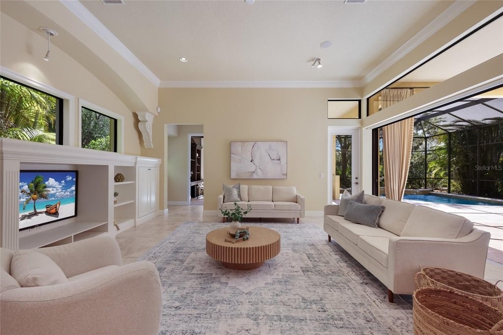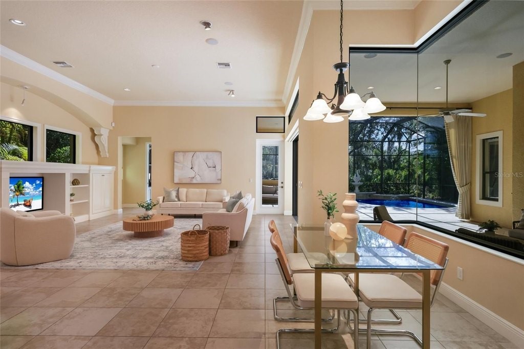 Situated on a lushly private and open south-facing preserve setting in The Country Club of Lakewood Ranch, this one-story three bedroom plus den residence showcases elegant architectural detailing throughout, volume coffered designer ceilings, a combination of IMPACT windows/sliders and hurricane protection throughout, and even a GENERATOR. Enlarged by four feet from Neal Signature's original Salerno floor plan offering 2,805 square feet of one-story living with an inviting lanai, abundant under cover entertainment spaces, a large heated pool, travertine decking, and pre-plumbed for an outdoor kitchen. Seamlessly connecting this resort-styled lanai to the oversized great room, living room, kitchen and den are glass doors that reveal a large open living concept with voluminous designer ceilings, large scale windows, crown moldings, corinthian columns and built-in details. Chefs will delight in the well appointed kitchen with sprawling counters, wood cabinetry, stainless steel appliances, wine fridge, a large walk-in pantry, an oversized breakfast nook area, and a light-filled formal dining room. Relax and unwind in the elegant owner's retreat offering two walk-in closets, direct lanai access, wood flooring, remote window coverings, and a spa-like bath with a dual sink vanity, large soaking tub, invigorating shower and separate water closet. Guests will be right at home in this split bedroom floorplan with two additional guest suites with plantation shutters, newly installed carpeting, and centered by a full bath. Additionally this fine residence offers a privately situated den with built-in office, double tray ceilings, plantation shutters, and the home's third full bath strategically positioned with direct access off lanai doubling as the home's pool bath. Other notable highlights of this all encompassing 3,773 total square foot residence in the gated and maintenance-included enclave of Silverwood includes, GENERATOR, a combination of hurricane enclosures and impact windows/slider, 2024 and 2019 AC units, a large laundry room with sink and cabinetry, 8' interior doors, a 2024 pool heater, and a two-car garage. Within the #1 top-selling master-planned community Lakewood Ranch, known for its vibrant lifestyle and proximity to dining, shopping, polo, community events, etc. PLUS non-mandatory membership opportunities to become a member of Lakewood Ranch Golf & Country Club, which include four 18-hole championship golf courses, tennis, state-of-the-art Fitness center, clubhouses, junior Olympic-sized pool, pickleball and more.