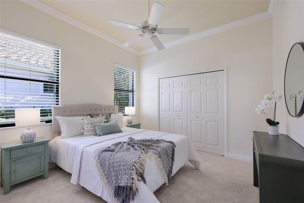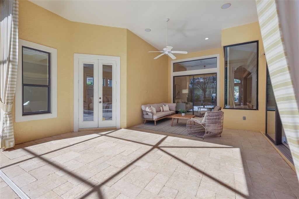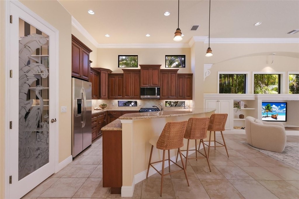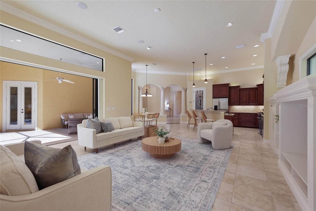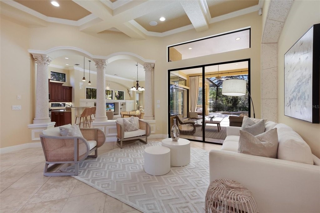 Situated on a lushly private and open south-facing preserve setting in The Country Club of Lakewood Ranch, this one-story three bedroom plus den residence showcases elegant architectural detailing throughout, volume coffered designer ceilings, a combination of IMPACT windows/sliders and hurricane protection throughout, and even a GENERATOR. Enlarged by four feet from Neal Signature's original Salerno floor plan offering 2,805 square feet of one-story living with an inviting lanai, abundant under cover entertainment spaces, a large heated pool, travertine decking, and pre-plumbed for an outdoor kitchen. Seamlessly connecting this resort-styled lanai to the oversized great room, living room, kitchen and den are glass doors that reveal a large open living concept with voluminous designer ceilings, large scale windows, crown moldings, corinthian columns and built-in details. Chefs will delight in the well appointed kitchen with sprawling counters, wood cabinetry, stainless steel appliances, wine fridge, a large walk-in pantry, an oversized breakfast nook area, and a light-filled formal dining room. Relax and unwind in the elegant owner's retreat offering two walk-in closets, direct lanai access, wood flooring, remote window coverings, and a spa-like bath with a dual sink vanity, large soaking tub, invigorating shower and separate water closet. Guests will be right at home in this split bedroom floorplan with two additional guest suites with plantation shutters, newly installed carpeting, and centered by a full bath. Additionally this fine residence offers a privately situated den with built-in office, double tray ceilings, plantation shutters, and the home's third full bath strategically positioned with direct access off lanai doubling as the home's pool bath. Other notable highlights of this all encompassing 3,773 total square foot residence in the gated and maintenance-included enclave of Silverwood includes, GENERATOR, a combination of hurricane enclosures and impact windows/slider, 2024 and 2019 AC units, a large laundry room with sink and cabinetry, 8' interior doors, a 2024 pool heater, and a two-car garage. Within the #1 top-selling master-planned community Lakewood Ranch, known for its vibrant lifestyle and proximity to dining, shopping, polo, community events, etc. PLUS non-mandatory membership opportunities to become a member of Lakewood Ranch Golf & Country Club, which include four 18-hole championship golf courses, tennis, state-of-the-art Fitness center, clubhouses, junior Olympic-sized pool, pickleball and more.